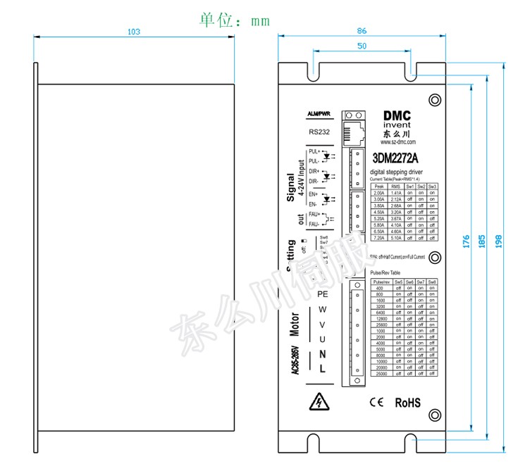 3DM2272A是基于DSP控制的高压三相步进电机驱动器。它是将先进的DSP控制芯片和三相逆变驱动模块结合一起所构成的新一代数字步进电机驱动器。驱动电压为AC85V-220V,适配电流在7.2A以下、外径86-130mm的各种型号的三相混合式步进电机。该驱动器内部采用类似伺服控制原理的电路,此电路可以使电机运行平稳,由于采用了平滑技术,低速时几乎没有震动和噪音,电机在高速时,仍保持较大的力矩。定位精度最高可达25600步/转。